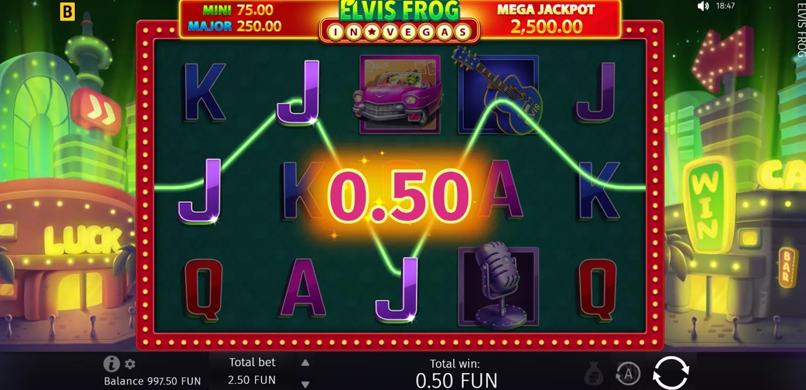 Este slot combina criativamente 3 temas diferentes ao mesmo tempo: animais, em particular, o sapo, a emoção de Las Vegas, a cidade dos cassinos e a excentricidade de Elvis Presley com suas roupas incríveis e penteado inesquecível. A grade de jogo é definida contra as ruas 2D verdes, de desenho animado e ligeiramente desfocadas de Vegas. Números e letras, bem como símbolos especiais como carros, guitarras e microfones, estão localizados nos rolos.