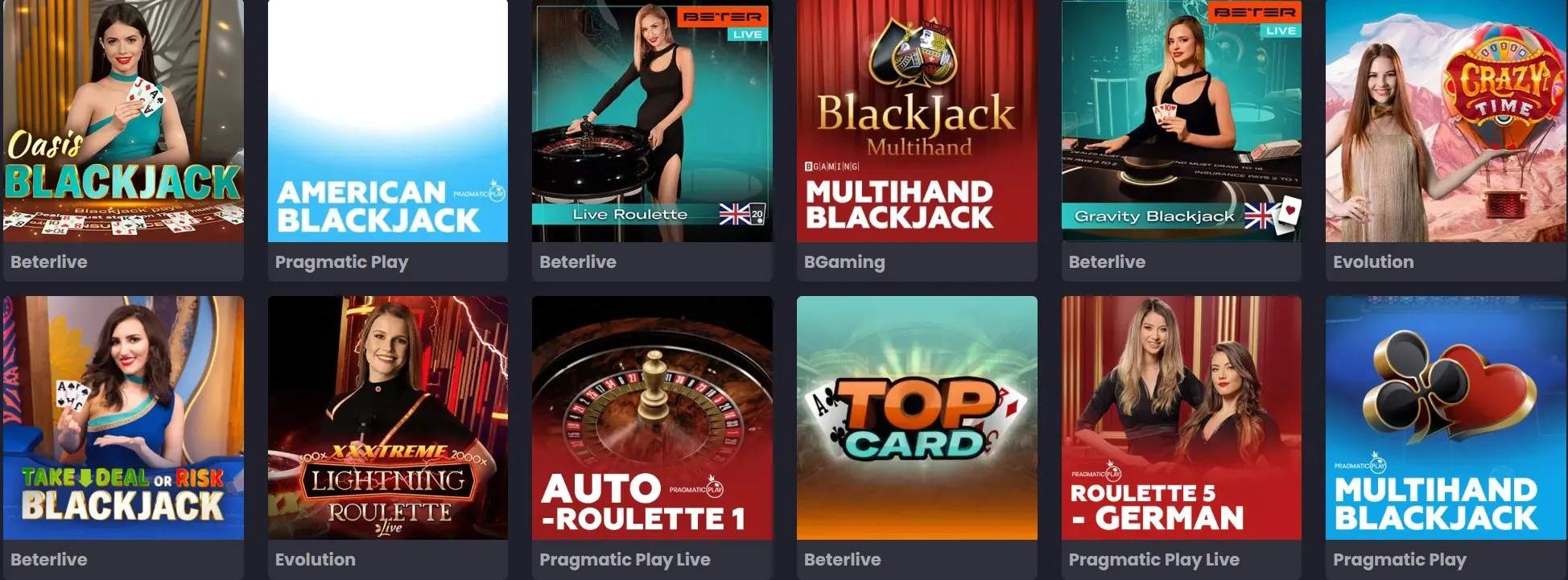 Less than 10 providers power the 600 games in the live casino lobby. They include popular names like Evolution Gaming, Pragmatic Play, Absolute Live Gaming, and Vivo Gaming. There are also some games from newer developers like BeterLive.