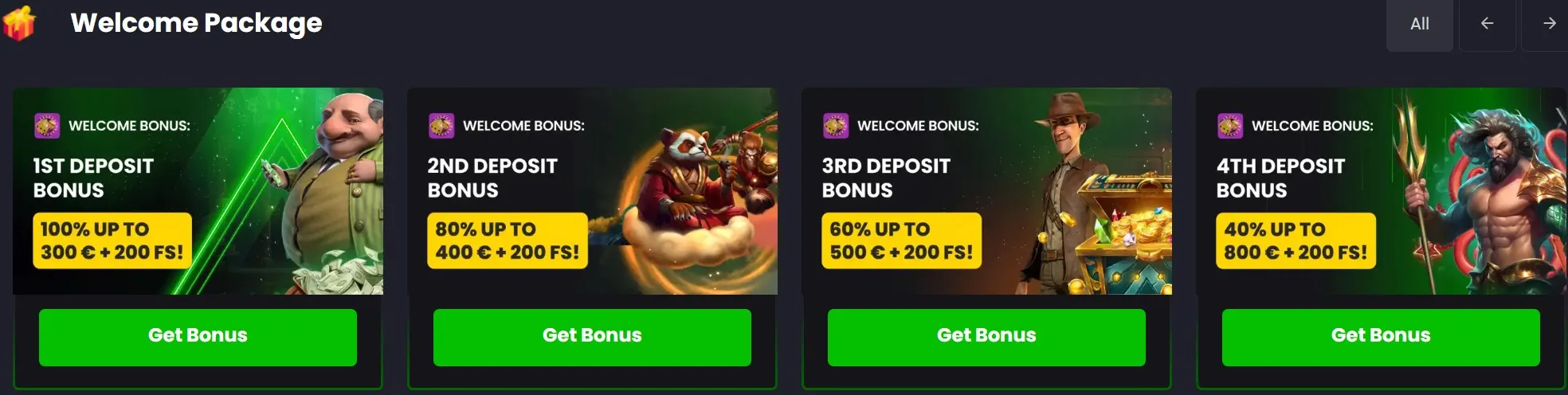 However, to claim the complete 380 free spins, you must deposit at least four times. You’ll get a certain number of spins, depending on how much you deposit. Here’s how it works: