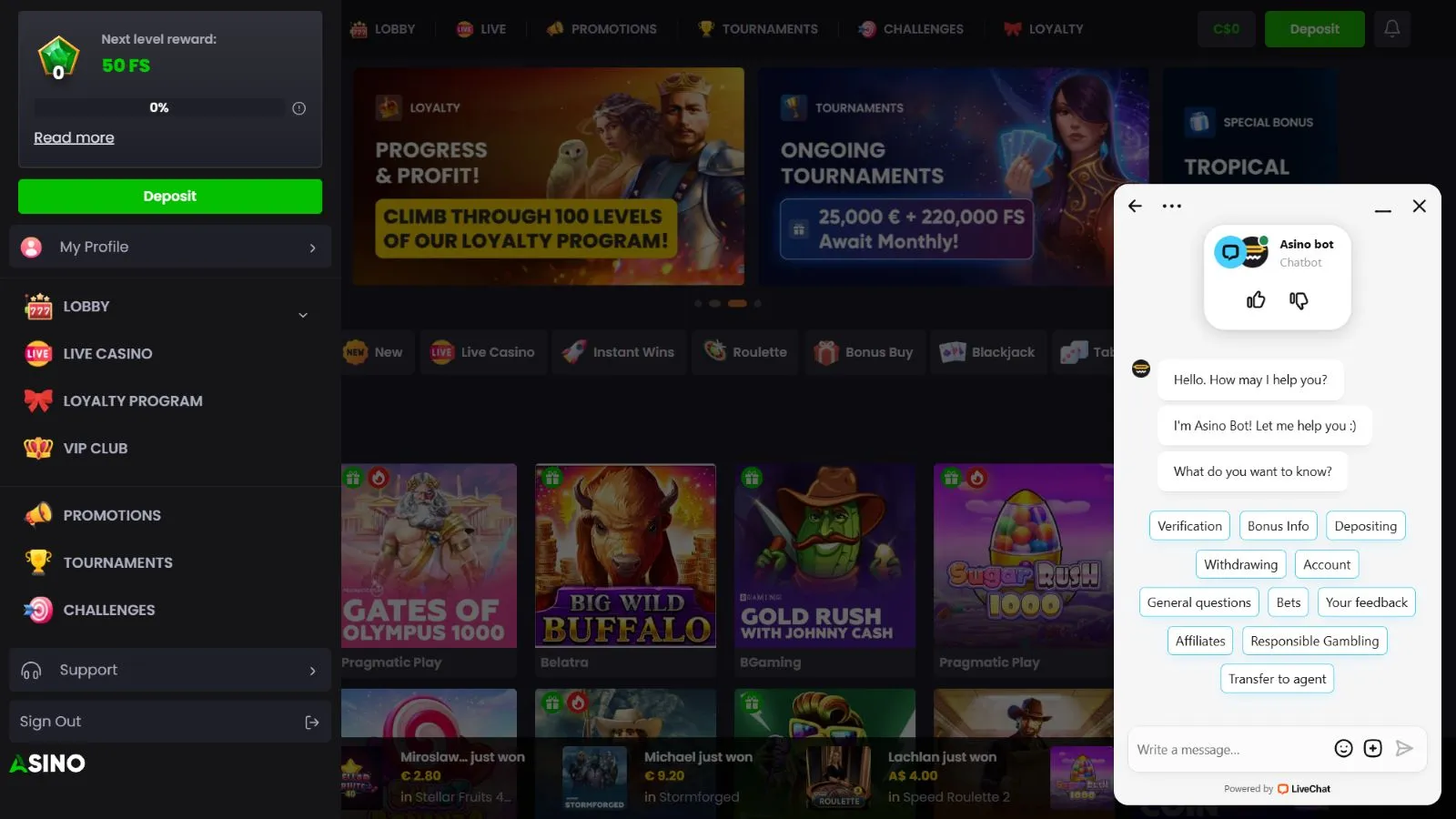 It’s pretty easy to get help at Asino if you face a difficulty or have a question. You can access the live chat feature through the support button from the menu bar. The chat begins with a bot attending to you but you can always request to discuss with an agent. The agents are available 24/7, so you’ll get a response to your queries quickly.
