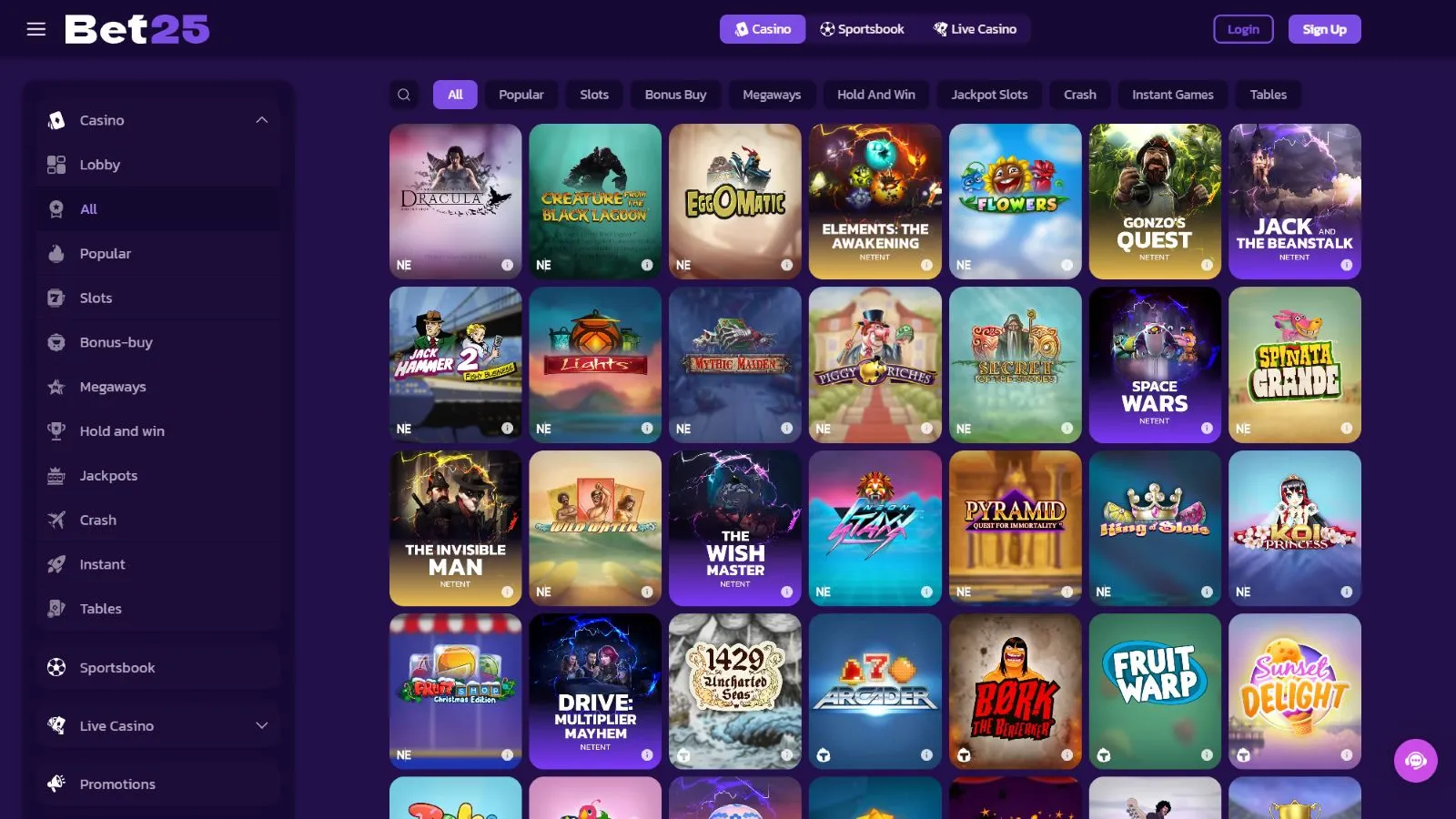 Bet25 is stacked with over 7,000 slots, enough to keep you spinning daily without getting tired. There are classic fruit machines, megaways, Bonus buys, jackpots, cluster pays, Hold’n Win games, and many others.