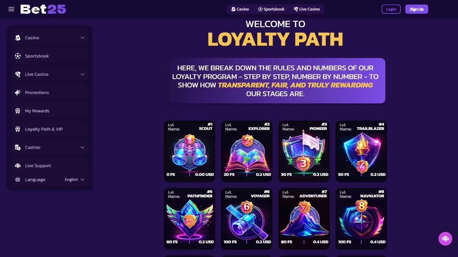 - Cashback % increases as you climb loyalty levels — up to 10% at Level 25.
