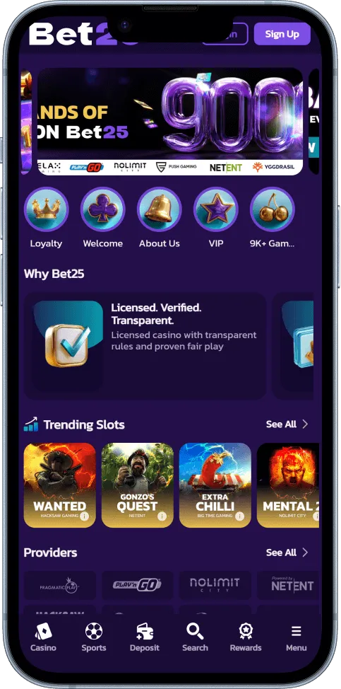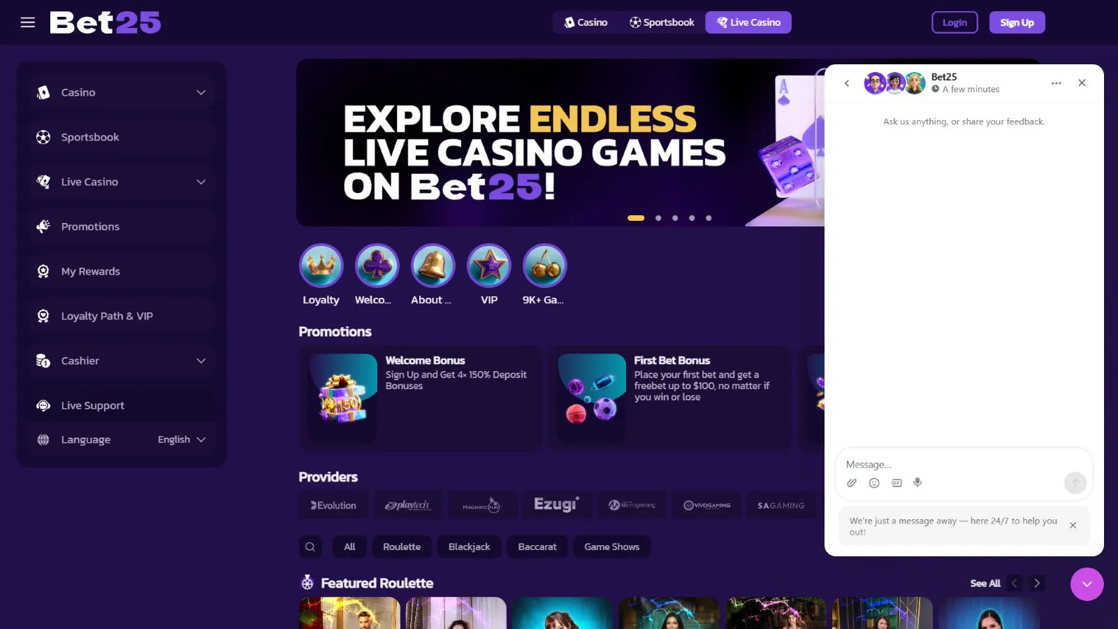 With over 9,000 casino games in the lobby, Bet25 is where boredom goes to perish. Whether you love to watch the reels spinning all day or interact with live dealers, you’ll find your favorite options available.