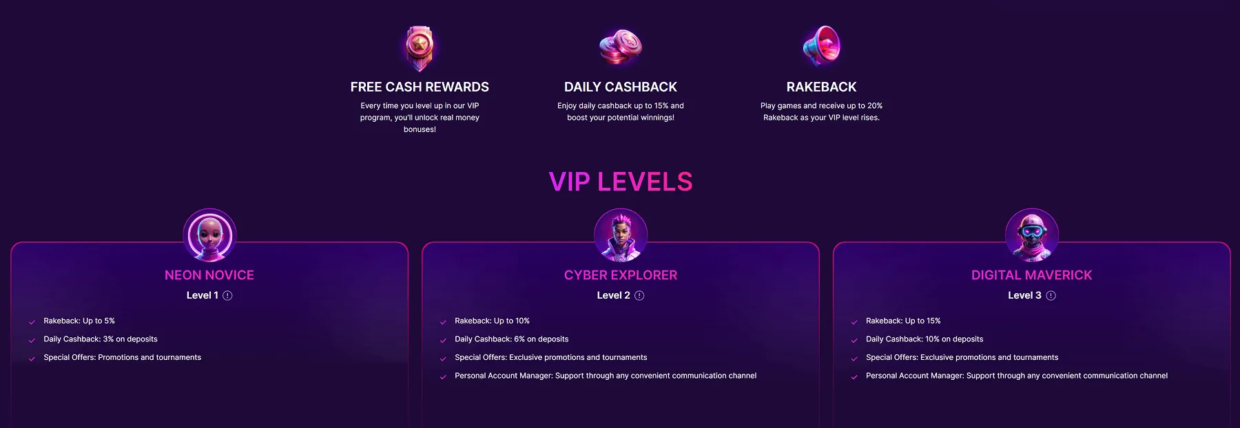 Bitstake VIP Club brings it with exciting rewards like free cash, daily cashback, and regular rakebacks. The frequency and percentage of these benefits increase as you move up the VIP levels.