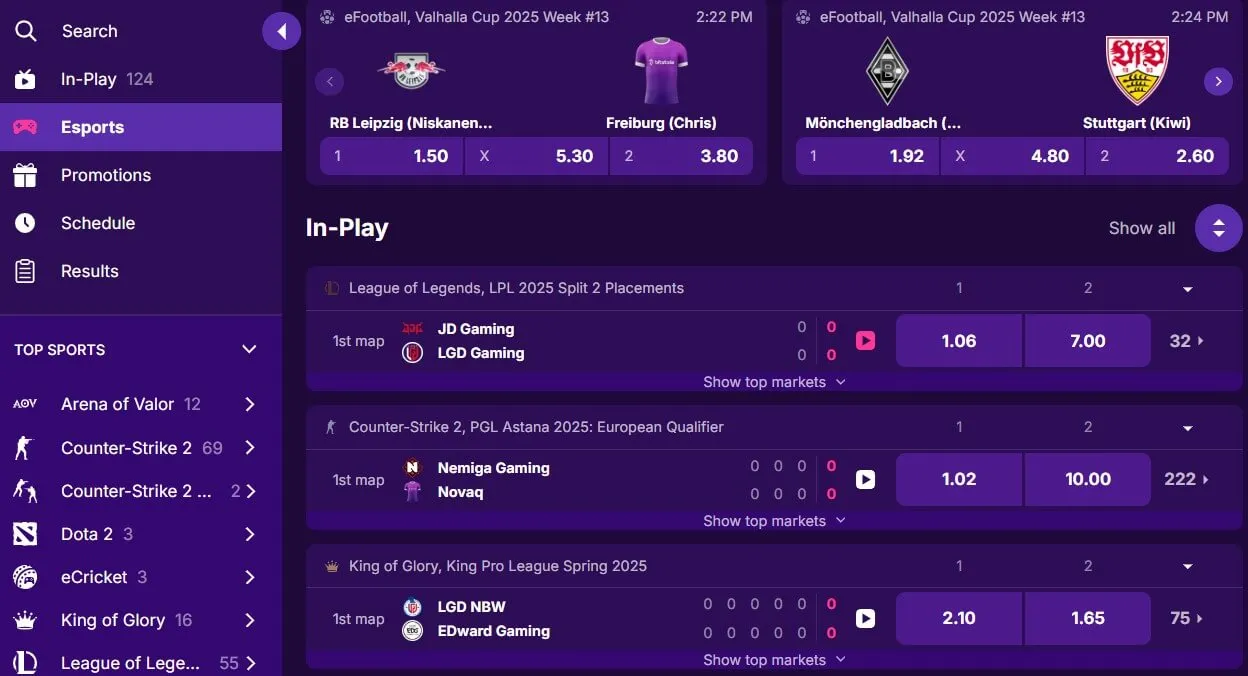 Accessing the sportsbook requires only one tap on the “Sports” link in the menu. This will unveil a colorful dashboard with neatly arranged markets and odds.