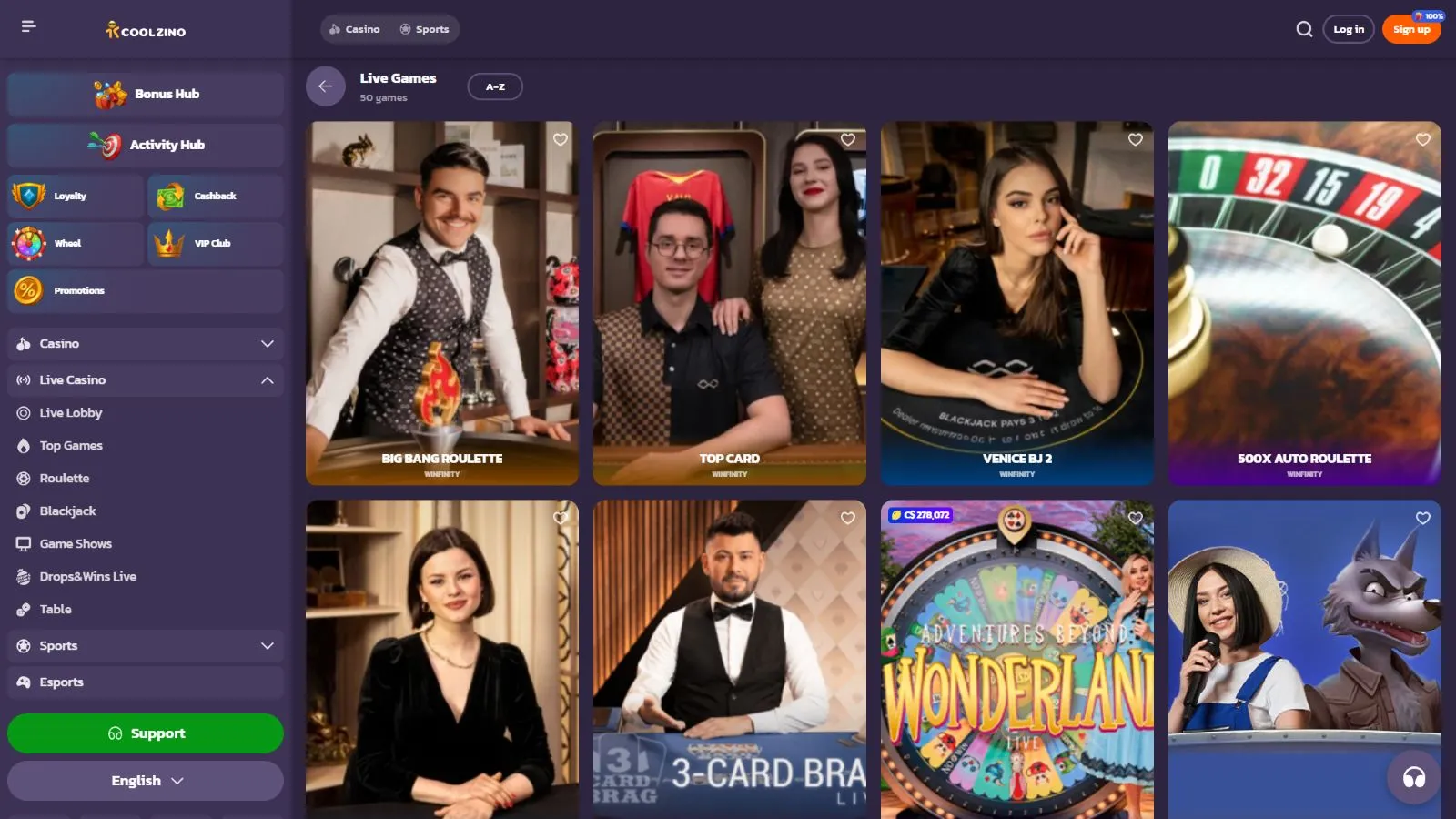 Other categories include video poker, scratch cards, bingo, crash games, and keno. Additionally, Coolzino features about 500 live games, including variants of blackjack, poker, roulette, and baccarat, as well as live game shows.