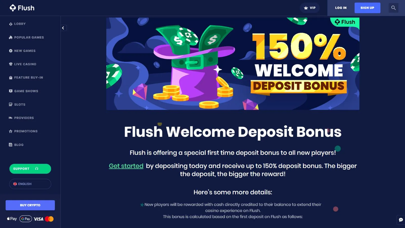 The left menu bar is thoughtfully designed for an intuitive gaming experience. It features an arrow button that expands the menu for a more detailed view. Various buttons are available here for quick navigation, including Lobby, Popular Games, New Games, Flush Originals (which showcases Provably Fair games), Feature Buy-In, Game Shows, Slots, Providers, and Promotions. You can also find a Language Select option, a Live Support button, and even a “Buy Crypto” button to ease the purchase of cryptocurrencies.
