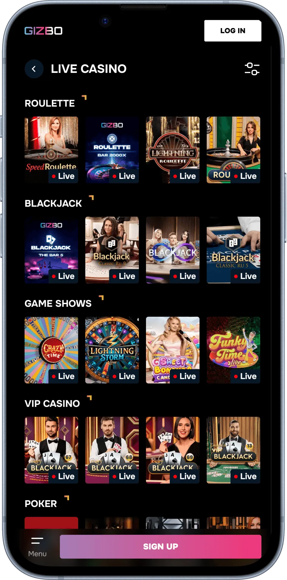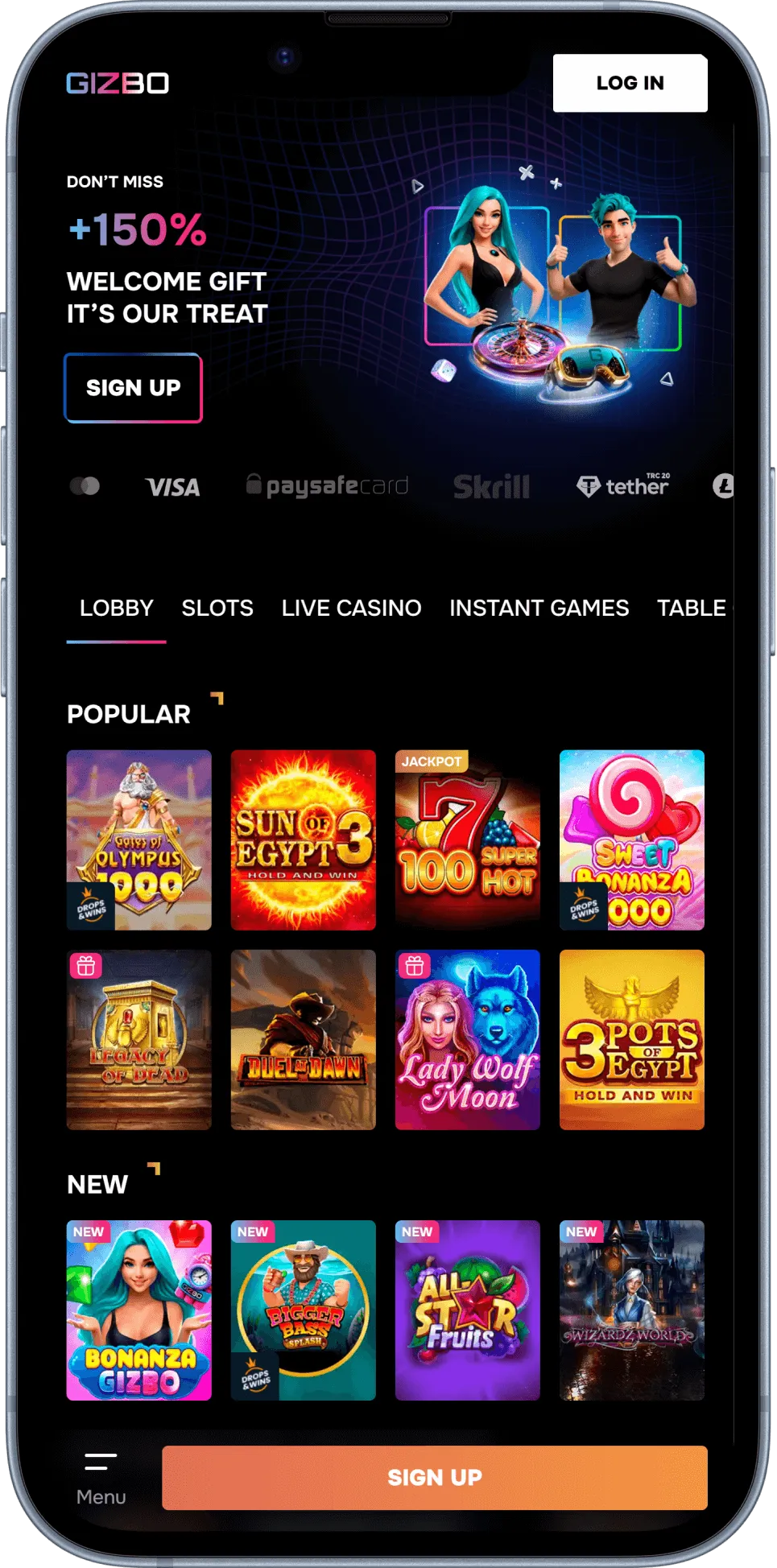 Gizbo offers all kinds of games – slots, table games, video poker, crash games, scratchcards, live casinos, and lotteries. It also offers sports betting.