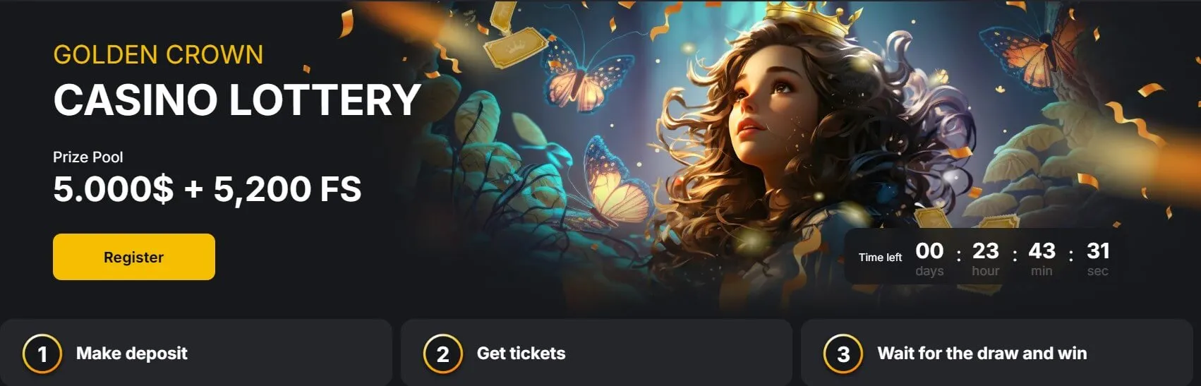 In addition to the video lotto games, Golden Crown has a traditional lottery page. There you can purchase tickets and participate in the draws. At the time of making this review, the ongoing lottery had a $5,000 and 5,200 Free Spins prize pool.