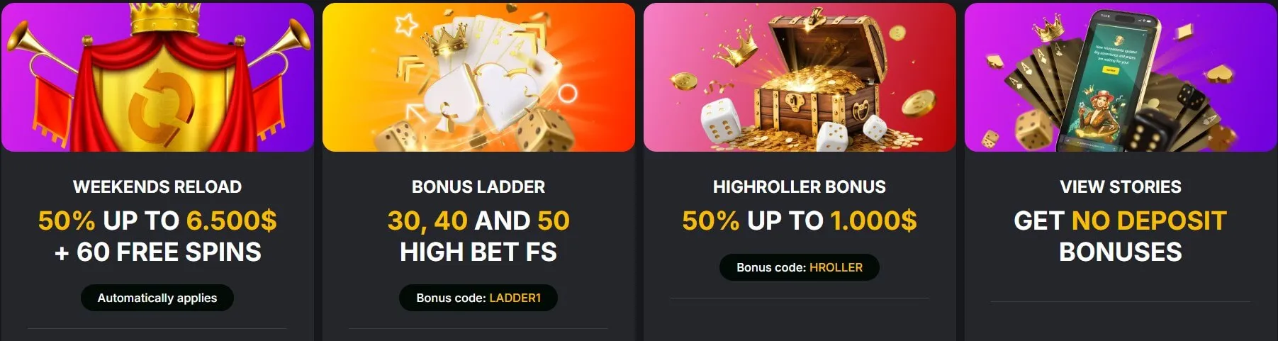 At Golden Crown, you can get 60 no-deposit free spins weekly for just viewing the casino’s stories. To get this bonus, visit the casino every weekday to check for new stories. On each day, you’ll find one part of a 5-symbol promo code.