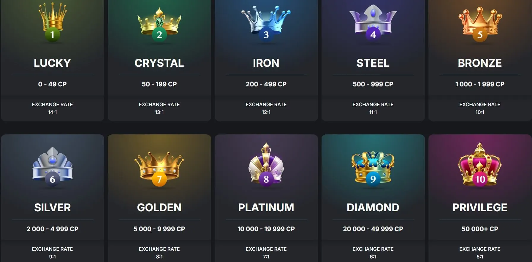 Ten elegant crowns await the loyal members of this crypto casino. As you wager with real money, you earn complimentary points (CP). A $70 wager on slots or $140 on other games equals 1 CP. The more points you gather, the higher your level on the VIP program and the more benefits you qualify for.