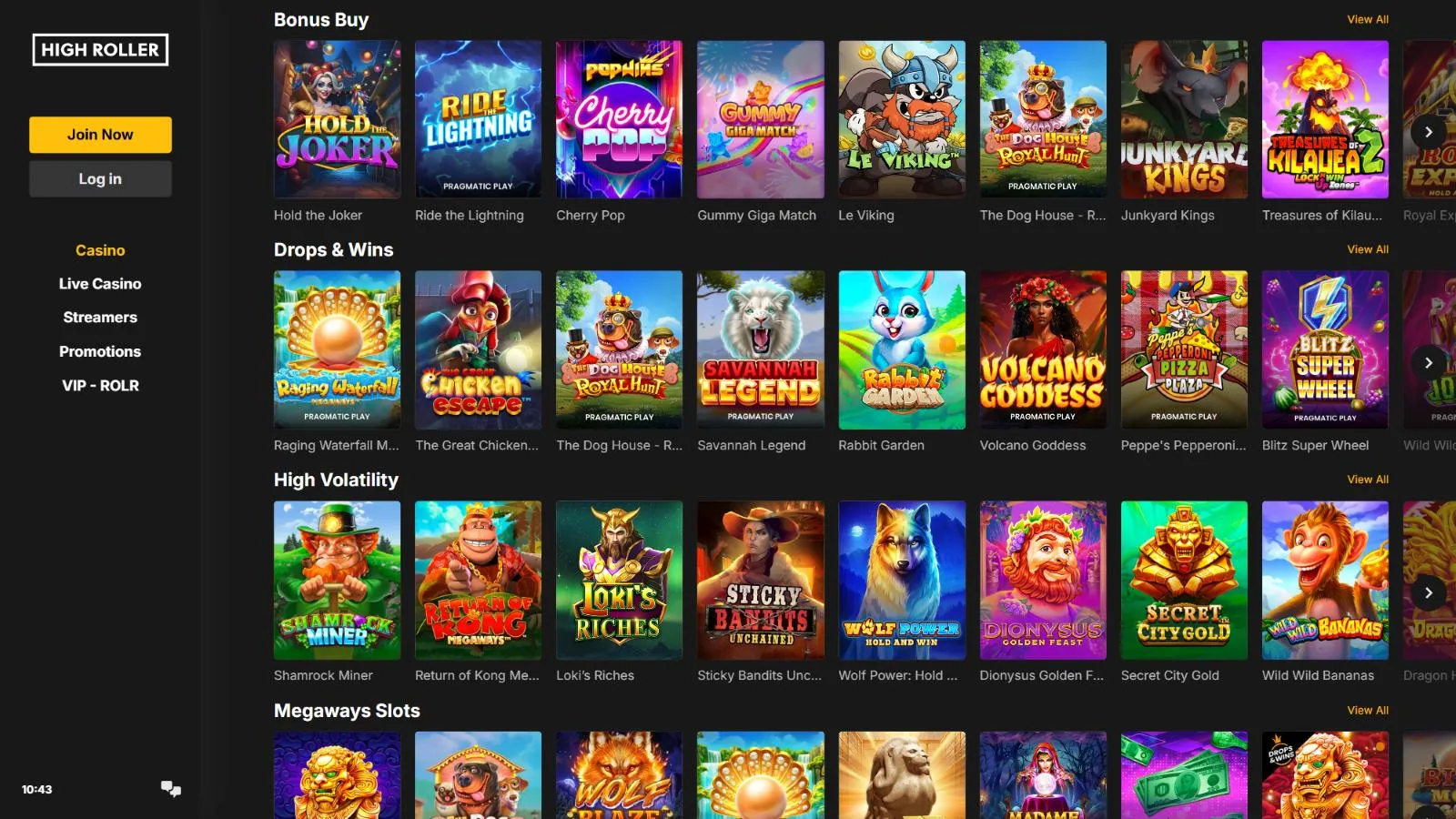 The Highroller casino interface is meticulously designed for seamless navigation. The categorization into Slots, Table Games, All Games, and Livespins enables quick access to your preferred games. Yet, if you’re in the mood to explore a specific provider, game feature, or even a particular game, the search field is your trusty companion to guide you there swiftly.