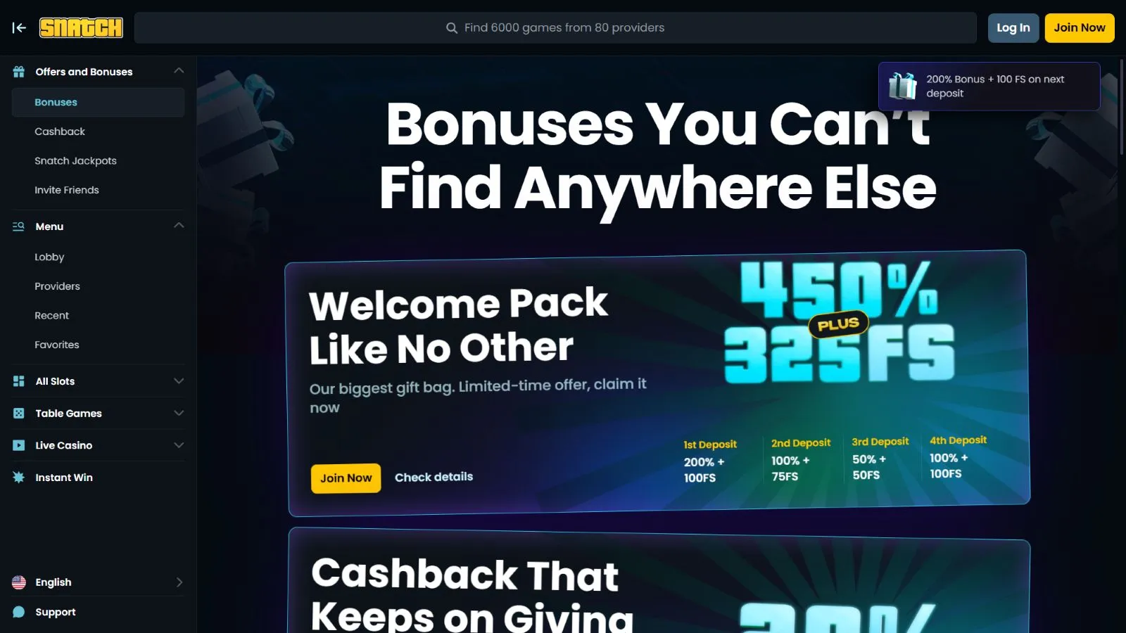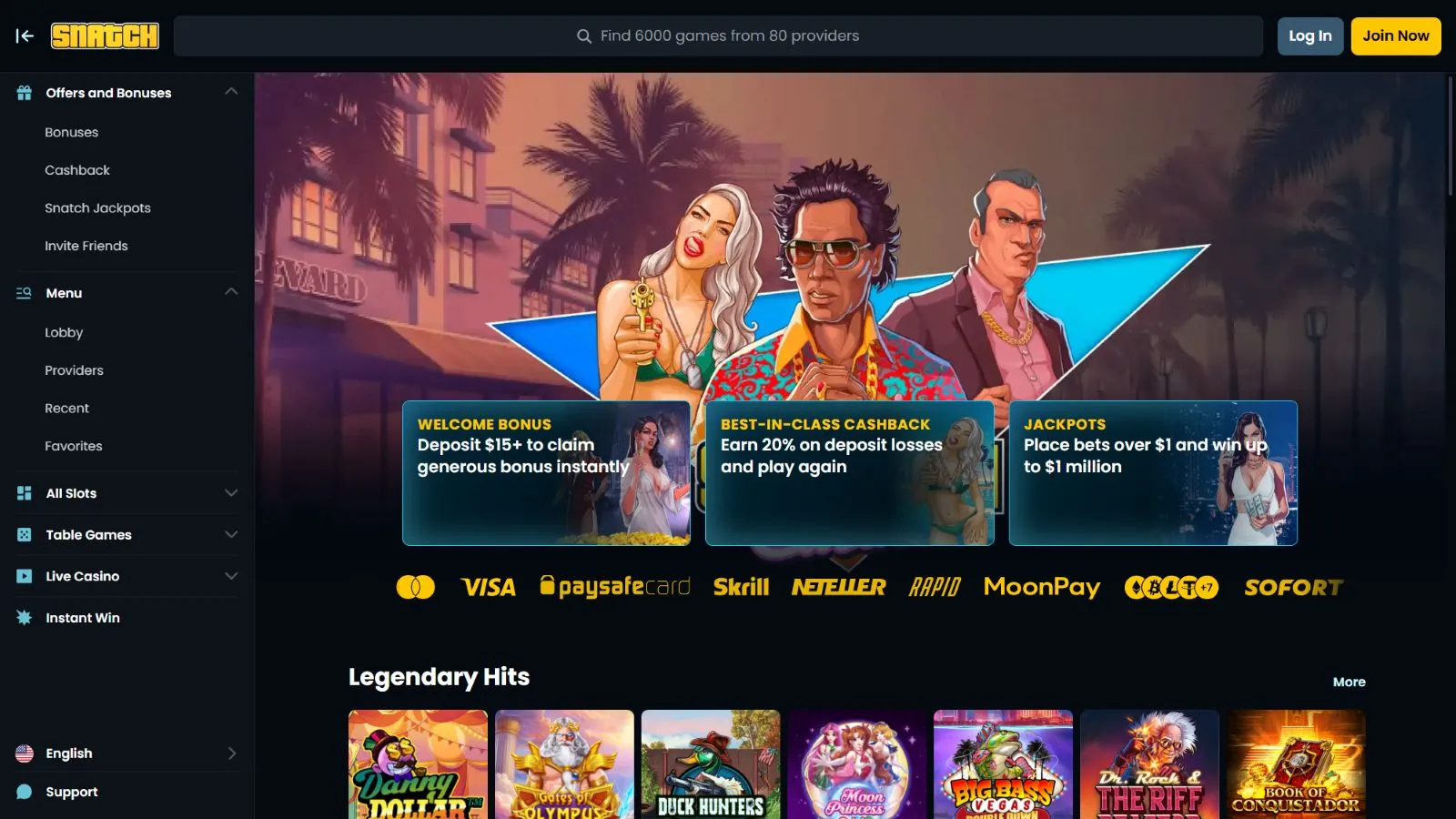 Snatch Casino дозволяє грати в улюблені слоти та настільні ігри з: